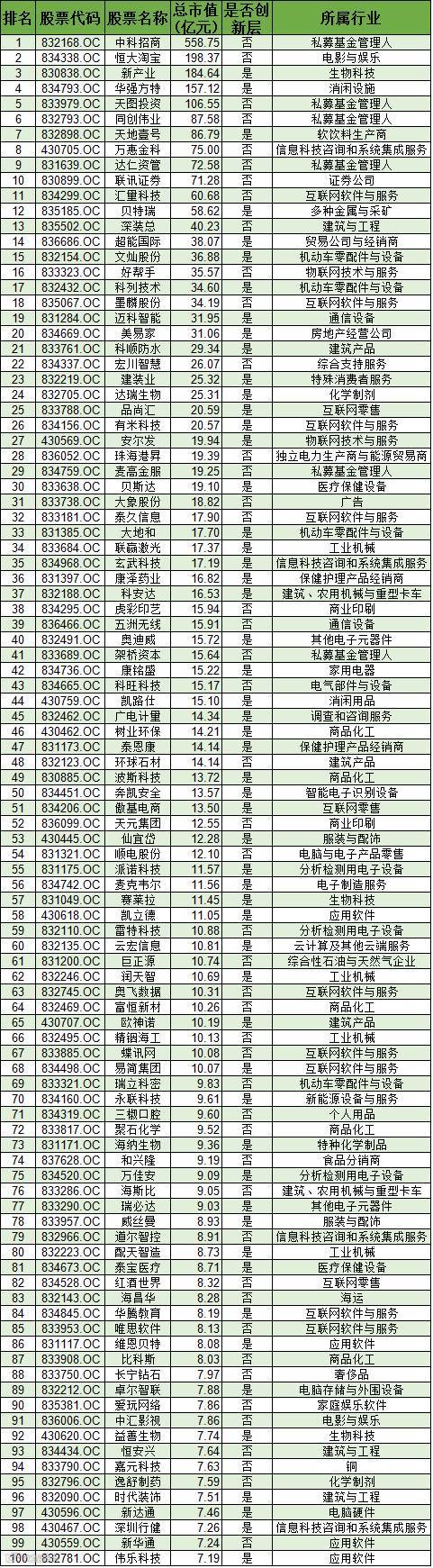 总市值排名前三的广东新三板企业分别为中科招商、恒大淘宝、新产业。以下是市值前100名的名单。