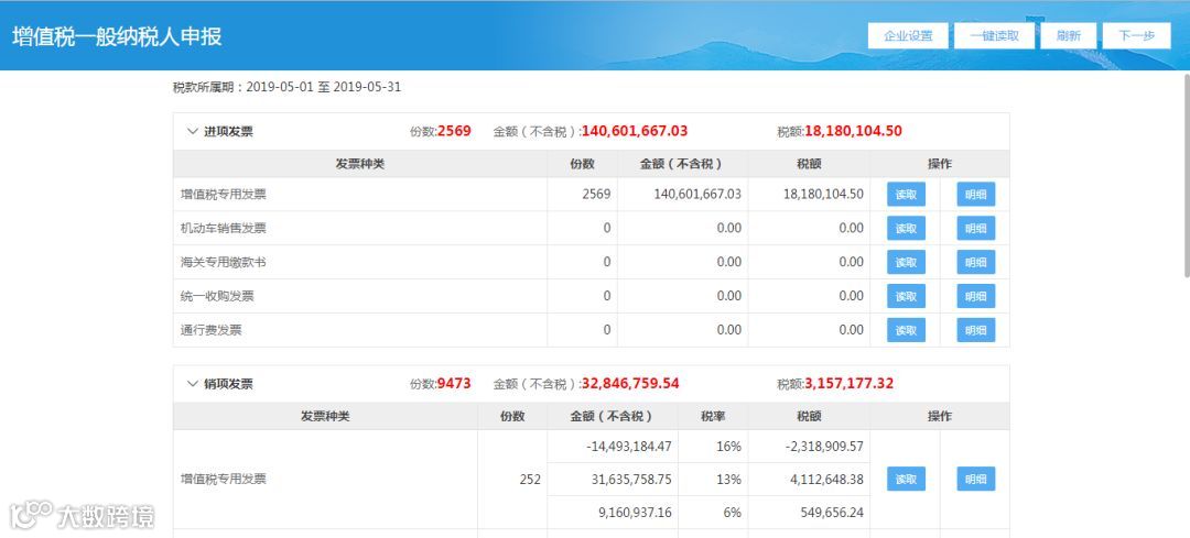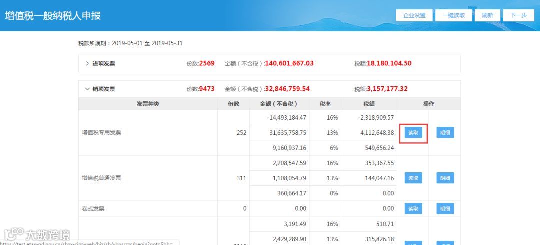 6、如企业发现自己仅某一票种或某一税率的当期发票数据有变动,可点击各票种后的“读取”按钮进行单项重新读取;