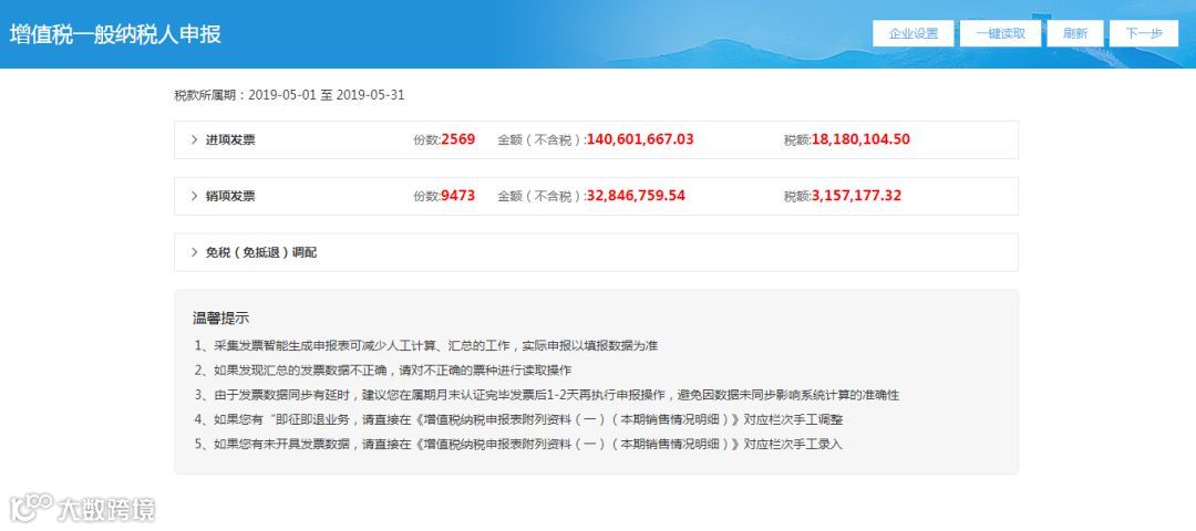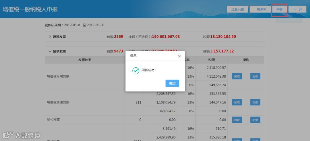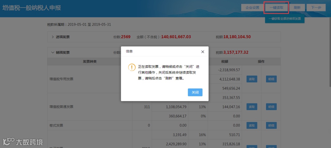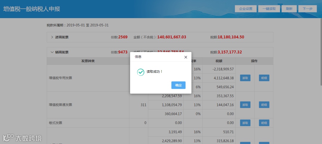 5、如企业发现自己当期发票数据系统未采集完整,或出于慎考虑希望重新采集发票,可点击发票汇总界面的【一键读取】按钮,系统将重新采集企业当期的全部发票数据并按不同票种,不同税率进行展示。读取完成之后,点击【确定】即可;