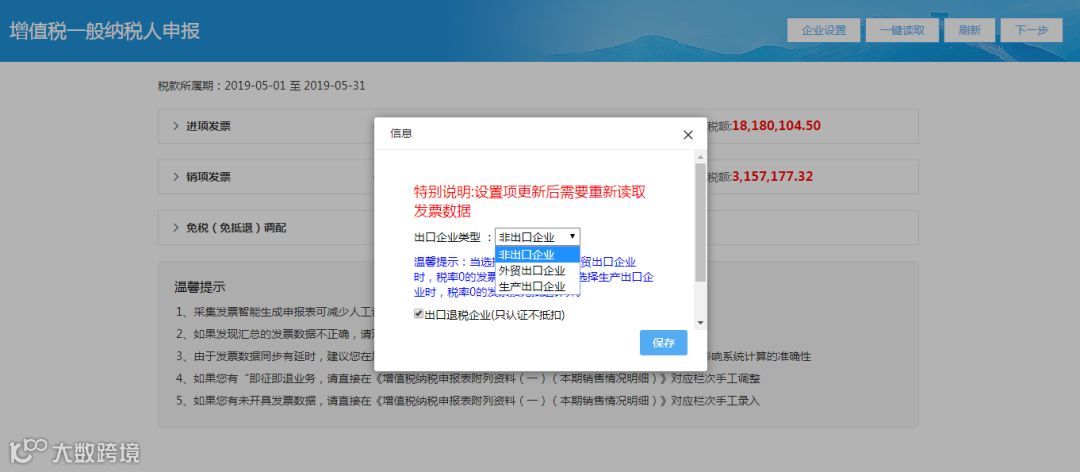 4、企业还可根据自身实际情况,选择是否为出口企业或者出口企业的类型。点击【企业类型设置】按钮,设置完成之后,点击【保存】;