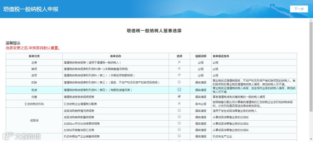 9、发票汇总界面点击【下一步】按钮,系统进入增值税一般纳税人选表设置界面,企业根据自己实际业务发生情况勾选需报送的申报表,勾选完成点击【下一步】进入增值税纳税申报表;