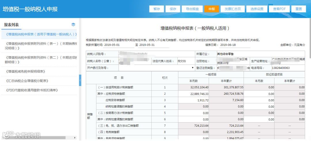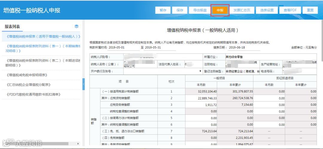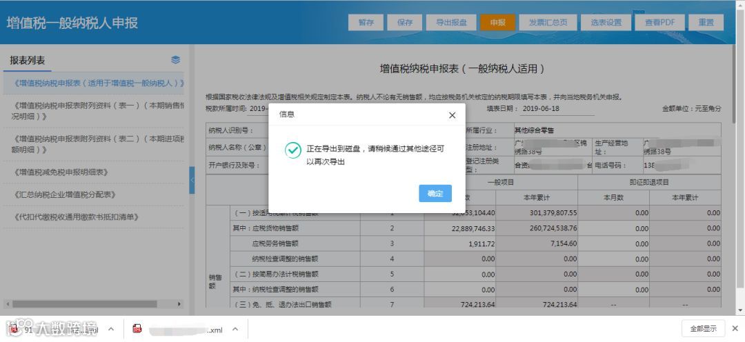 11、点击【关闭】进入申报表填写界面,可以看到在页面左边显示一个报表列表,实现主附表之间的切换,可以点击链接在主表和各个附表之间进行切换。系统会将发票汇总界面的发票数据带入对应的附表(进项发票数据进入附表二,销项发票数据进入附表一,系统提供了完善的表内、表间的自动计算和校验的功能,用户只需填写必需的几项关键业务数据,即可完成从附表到主表的计算),除已带入的发票数据外,纳税人可根据自己实际业务发生情况填写其他数据,此界面可返回发票汇总界面重新查看发票数据。如图所示;