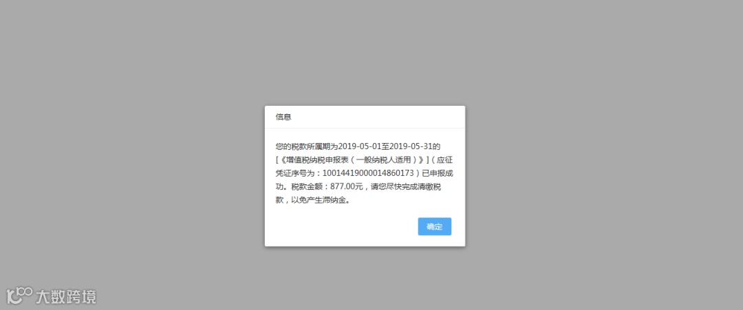 13、点击【申报】按钮后,系统会进一步校验数据的准确性,若校验失败,会弹出相应的提示信息,可返回修改;若校验成功数据无误,会显示申报成功回执单;点击【确定】可跳转附加税申报。