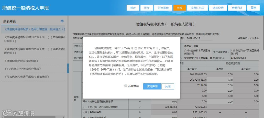 10、选表设置完成后点击【下一步】按钮进入到申报表填写界面。系统提示通过填写《适用加计抵减政策的声明》,来确认适用加计抵减政策。可点击【填写声明】进入《适用加计抵减政策的声明》界面;