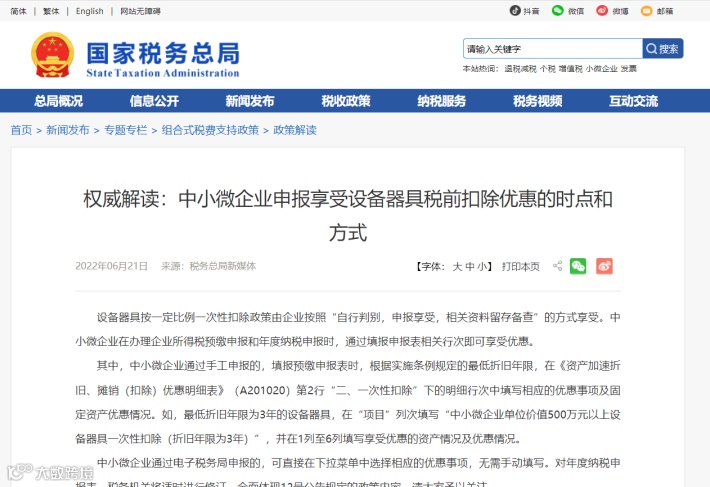 根据《关于中小微企业设备器具所得税税前扣除有关政策的公告》(财政部 税务总局公告2022年第12号)规定:“中小微企业在2022年1月1日至2022年12月31日期间新购置的设备、器具,单位价值在500万元以上的,按照单位价值的一定比例自愿选择在企业所得税税前扣除。其中,企业所得税法实施条例规定最低折旧年限为3年的设备器具,单位价值的100%可在当年一次性税前扣除;最低折旧年限为4年、5年、10年的,单位价值的50%可在当年一次性税前扣除,其余50%按规定在剩余年度计算折旧进行税前扣除。