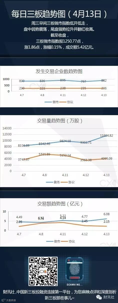 今日早间三板做市指数低开低走,盘中弱势震荡,尾盘强势拉升并翻红收高。截至收盘,三板做市指数报1250.77点,涨1.86点,涨幅0.15%,成交额5.42亿元。