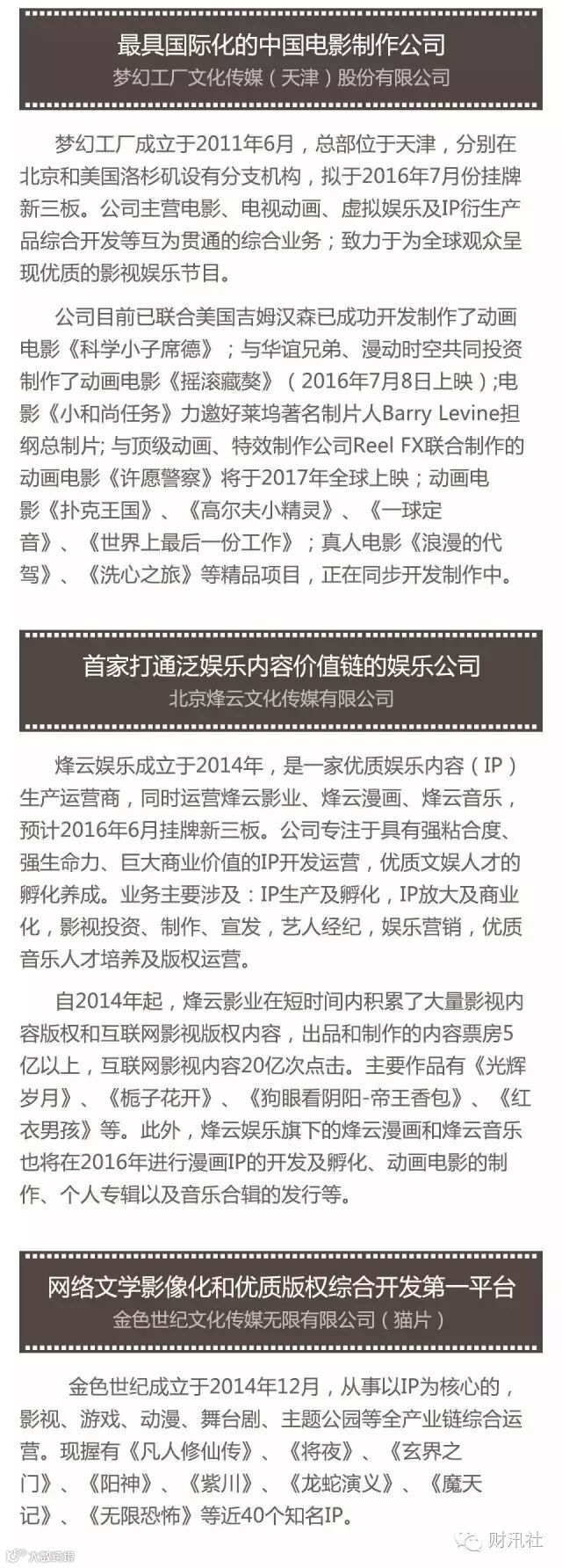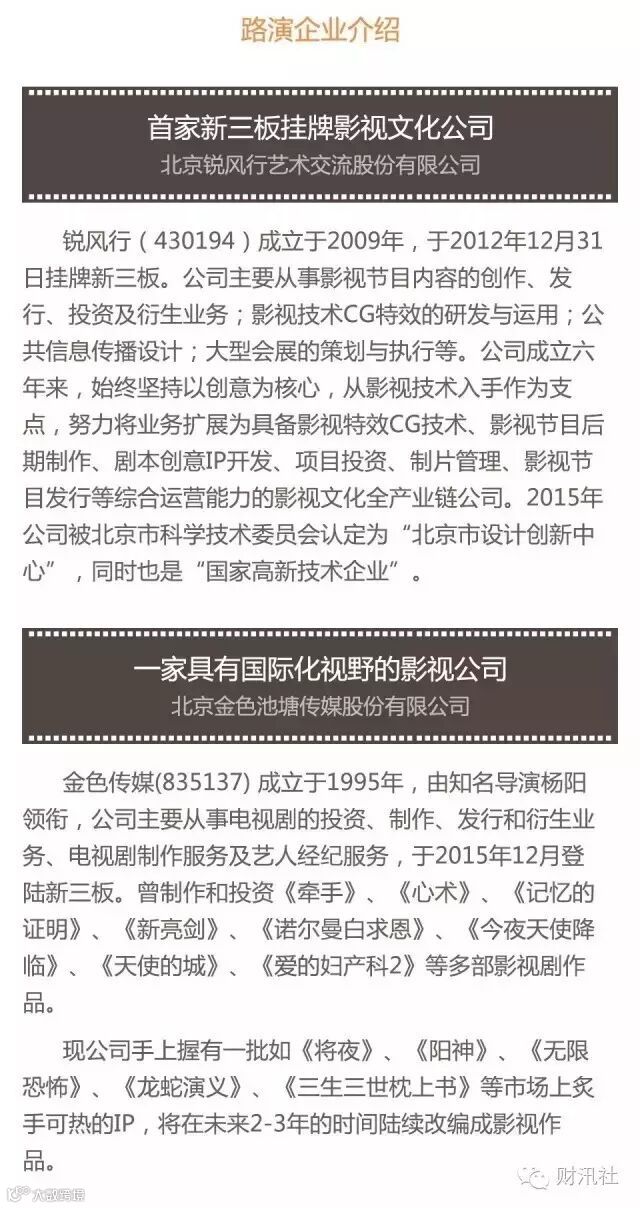 导读:“掘金三板主题秀”第三期来喽!本次活动我们锁定在影视文化传媒行业,不仅仅是现在创投的“风口”,也是新三板市场
