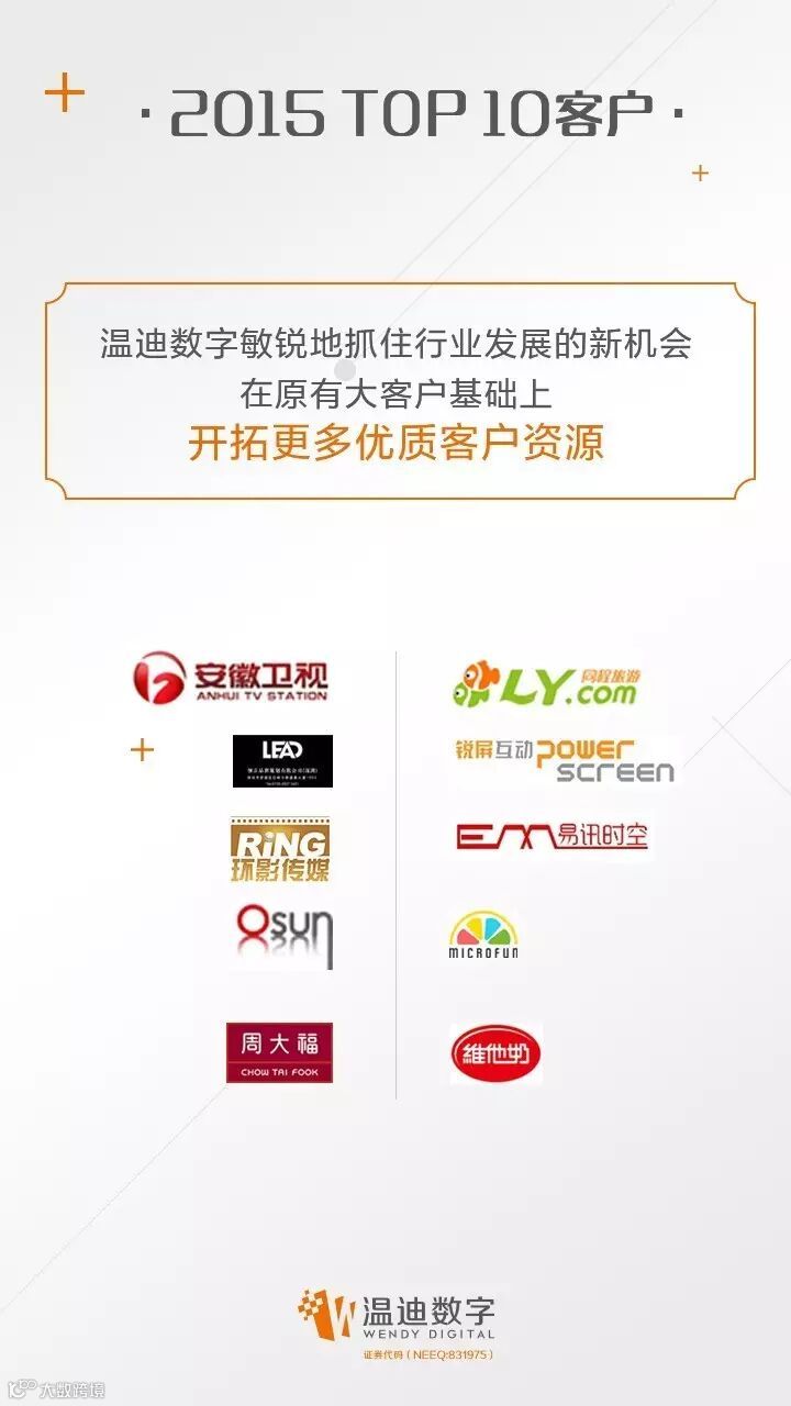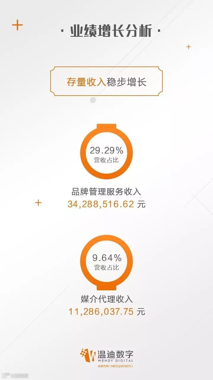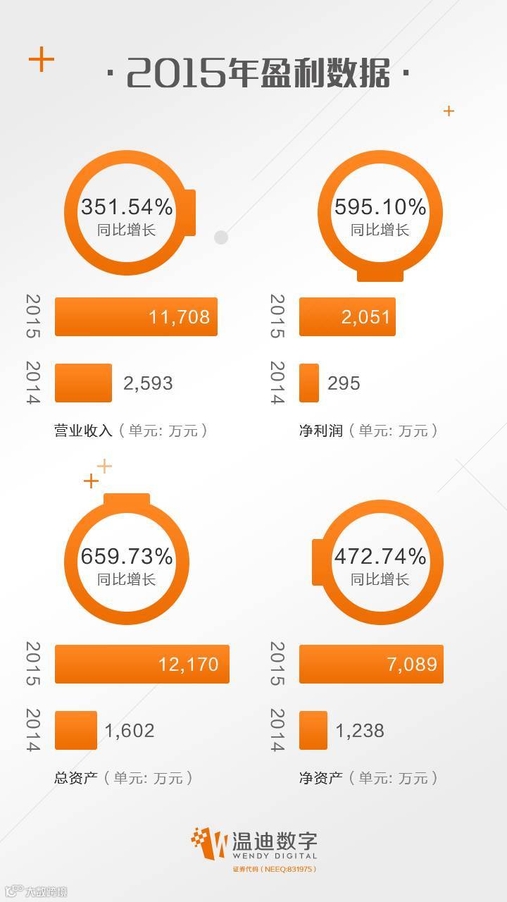 在存量收入稳步增长、增量收入大幅提升之下,去年温迪数字营业收入同比增长351.54%,净利润同比大增595.1%,交出了一份优秀的成绩单。2016年的业绩增长值得期待。
