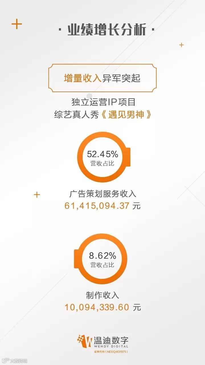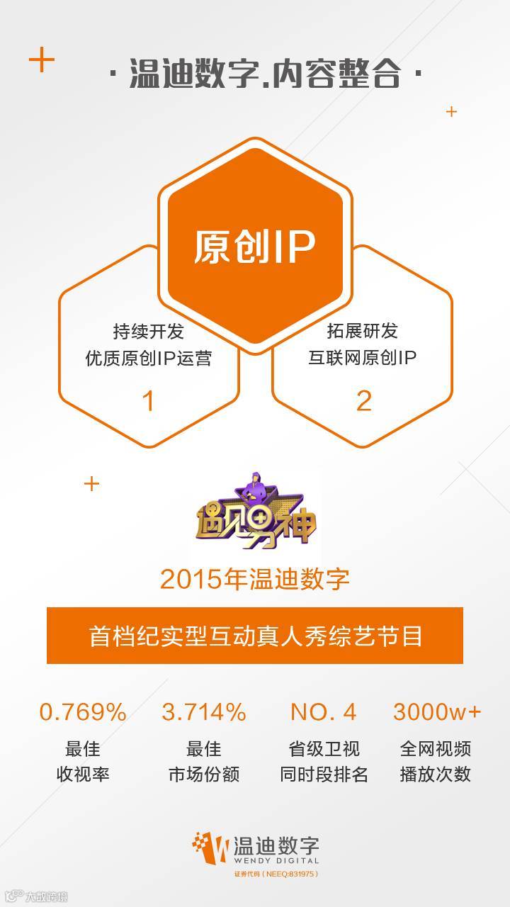 公司重磅打造的原创IP——《遇见男神》节目大获成功,最佳收视率达0.769%。此外,公司迅速整合亚洲地区的优质影视IP和明星资源,促进了数字化运营和商业开发。