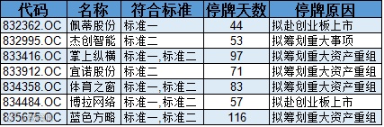 按照创新层公司挂牌以来的情况看,共有93家公司从未出现交易(和100家差距不大,看来都是“惯犯”),其中有7家公司是自挂牌起就开始停牌至今(见下表),这7家公司都是协议转让,其中有2家准备到创业板IPO,这些公司停牌时间都超过2个月,最长的达半年,看来对于能否在二级市场交易似乎并不在意。