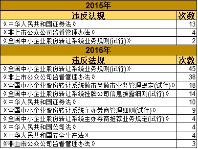 新三板企业去年主要违反了16项法规,其中违反《中华人民共和国证券法》的次数最多,为13次,其次是违反《非上市公众公司监督管理办法》4次,违反《全国中小企业股份转让系统业务规则(试行)》2次。