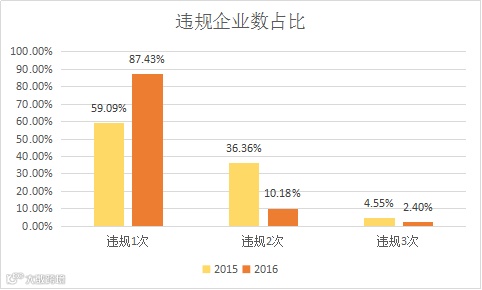 去年违规次数最多的是3次,有3家企业,分别是国贸酝领、可来博、中科招商,24家企业违规2次,39家企业违规1次;今年违规次数最多的也是3次,有4家企业,分别是参仙源、仁新科技、时空客、天运股份,17家企业违规2次,146家企业违规1次。
