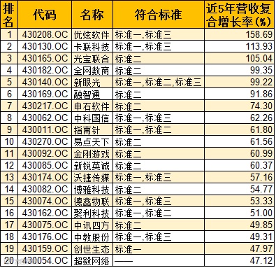 有61家公司公布了近五年的营业收入复合增长率,前三名公司的营收复合增长率都超过了100%,其中优炫软件158.69%、卡联科技113.93%、光宝联合105.04%。可以看到在营收增速上,互联网、软件等高科技行业一骑绝尘,拥有相当高的成长性。