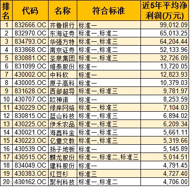 有177家挂牌公司公布了近五年的净利润,有8家公司净利润平均值超过1亿元,最高是齐鲁银行9.9亿元,第二、三名分别是东海证券6.5亿元和华强方特6.42亿元。具体排名如下。