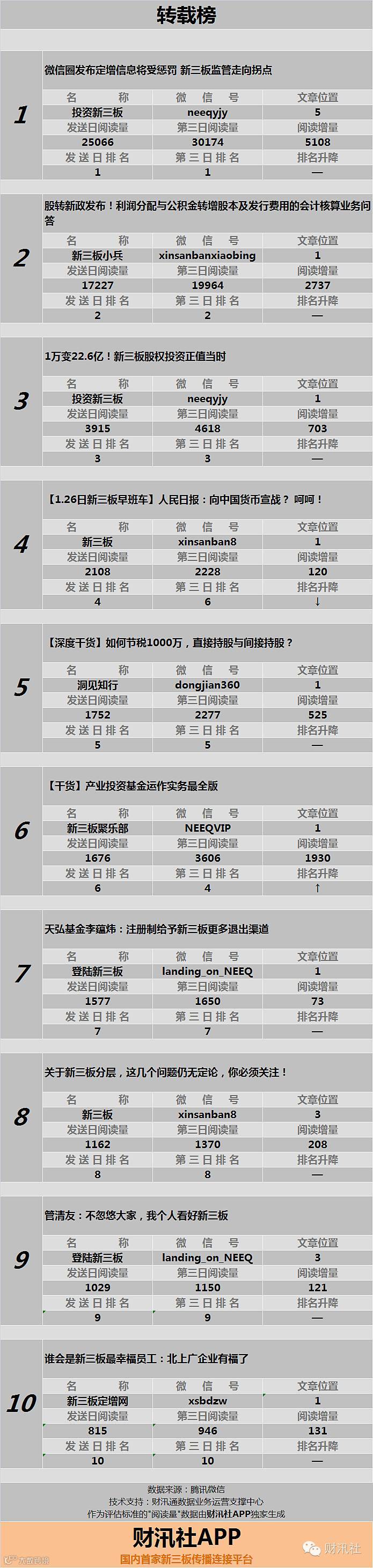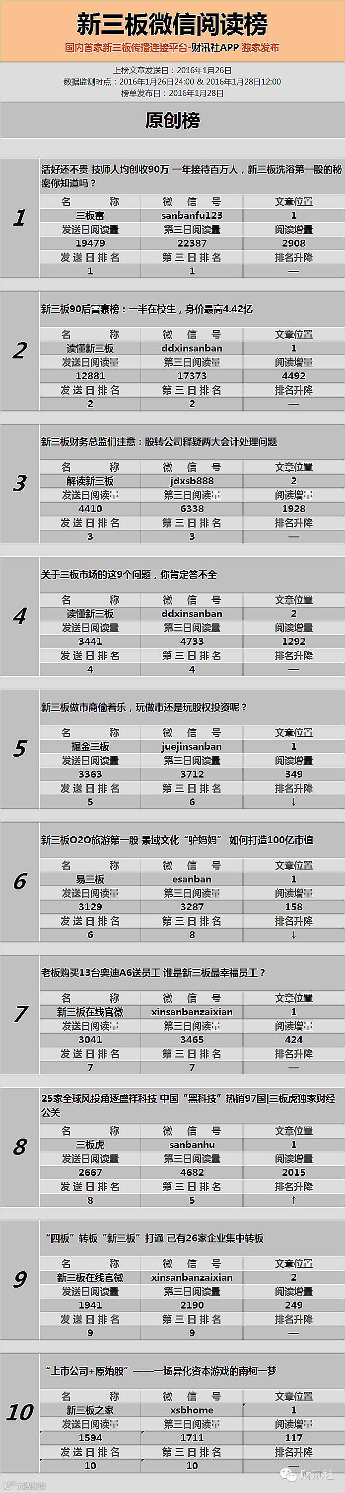 今天的《新三板微信阅读榜》上榜文章是上榜公众号于2016年1月26日发送的文章.对于今日上榜文章,社掌梳理出以下信息: