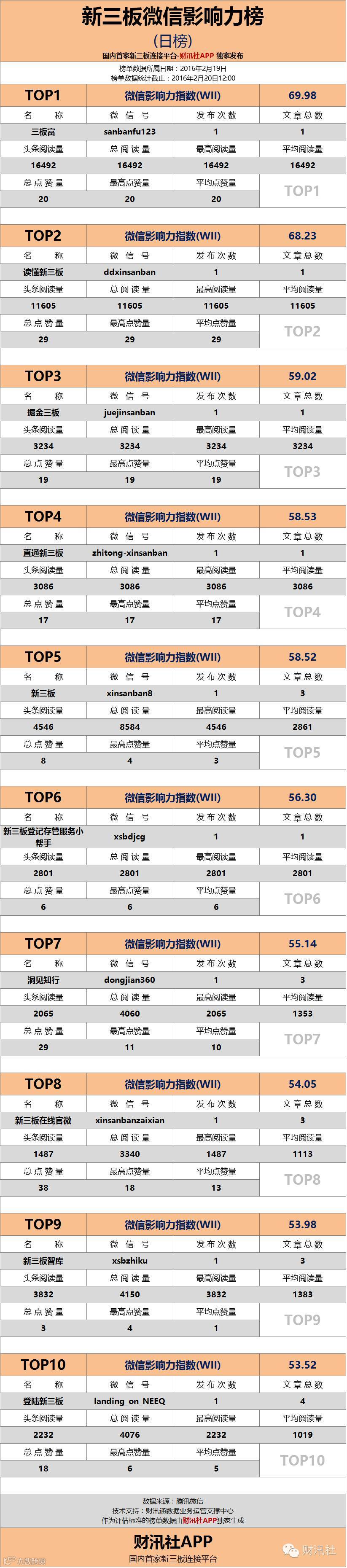 本期影响力榜的监测范围是2016年2月19日新三板领域各微信公众号的相关指标。