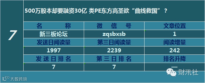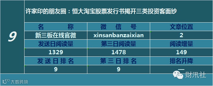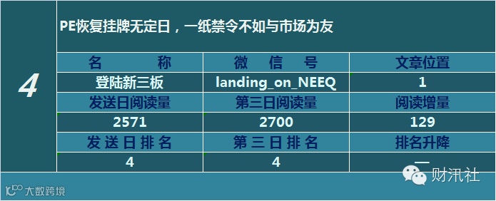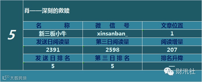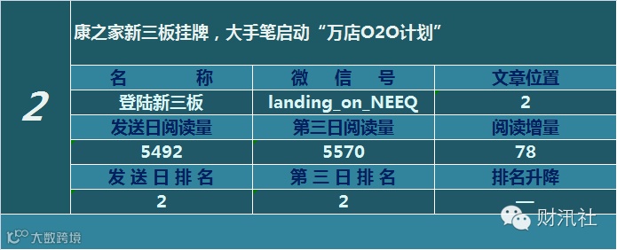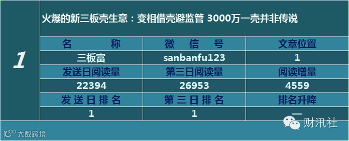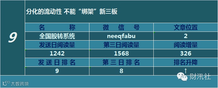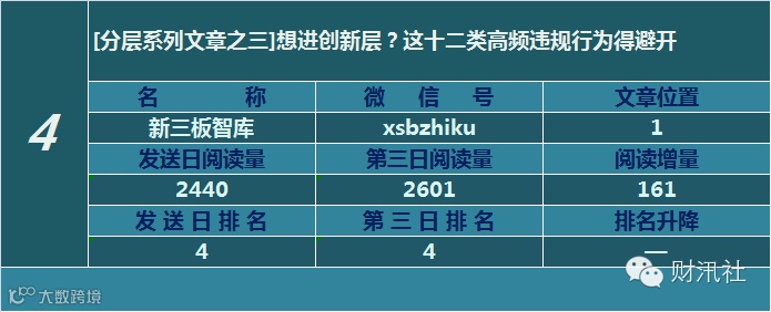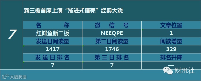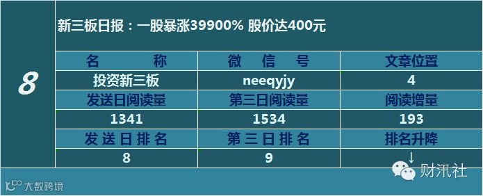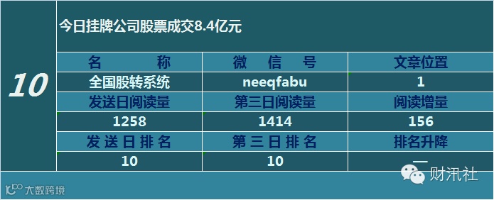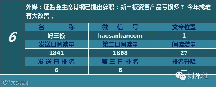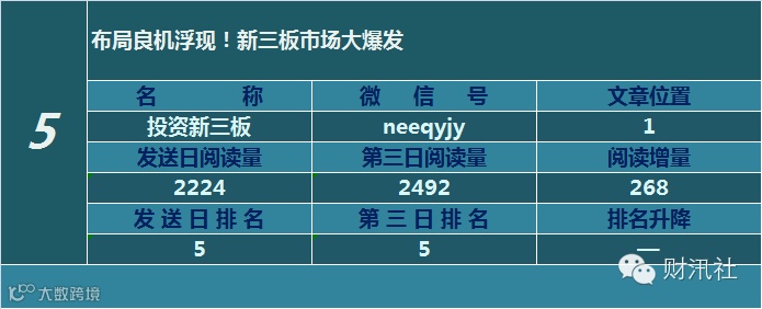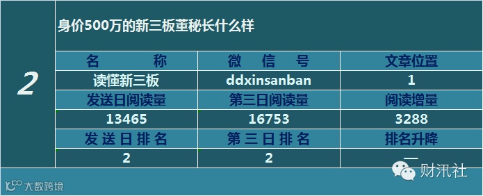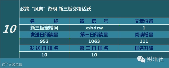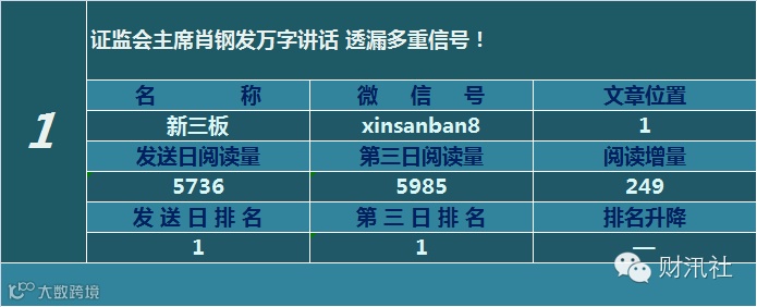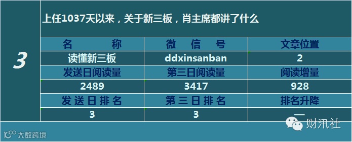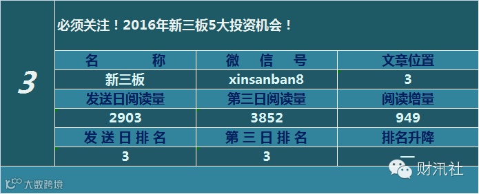 一日定座次,三日分高下。由@财汛社(ID:caixunshe)独家发布的《新三板微信阅读榜》以文章发送日的阅读量作为排名依据,而以第三天中午的阅读量数据作为文章可读性和话题性的孰优孰劣之参考,同时也体现公众号用户的活跃度和粘性。