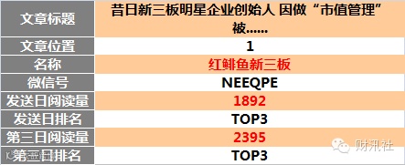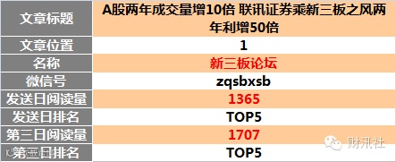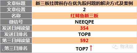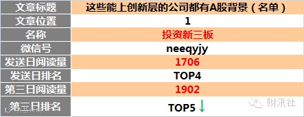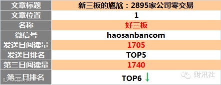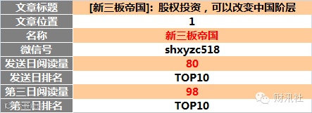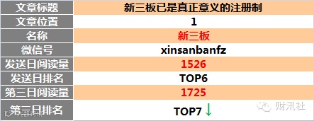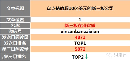 一日定座次,三日分高下。由@财汛社(ID:caixunshe)独家发布的《新三板微信阅读榜》以文章发送日的阅读量作为排名依据,而以第三天中午的阅读量数据作为文章可读性和话题性的孰优孰劣之参考,同时也体现公众号用户的活跃度和粘性。