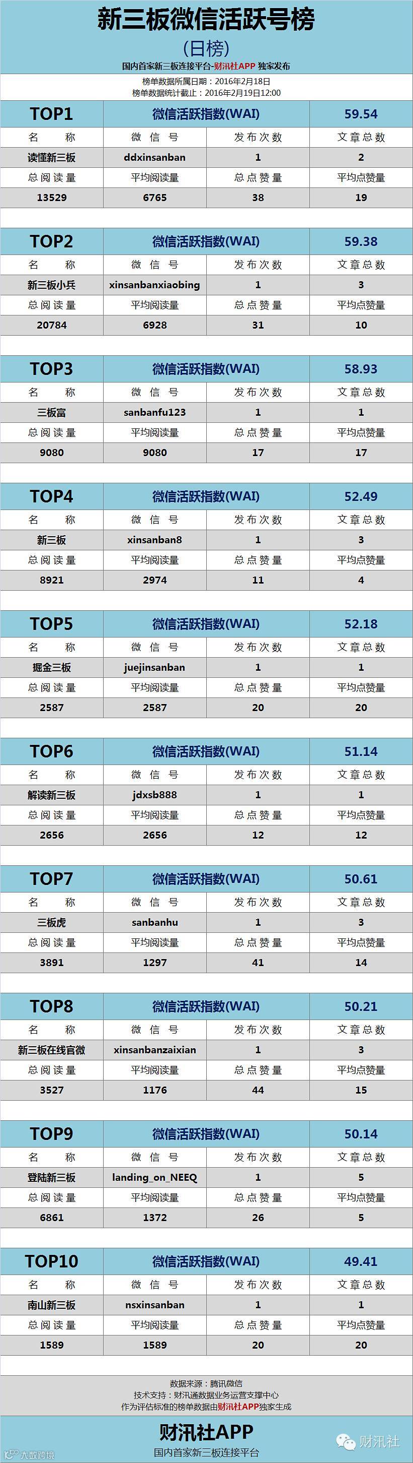 本期活跃号榜的监测范围是2016年2月18日新三板领域各微信公众号的相关指标。