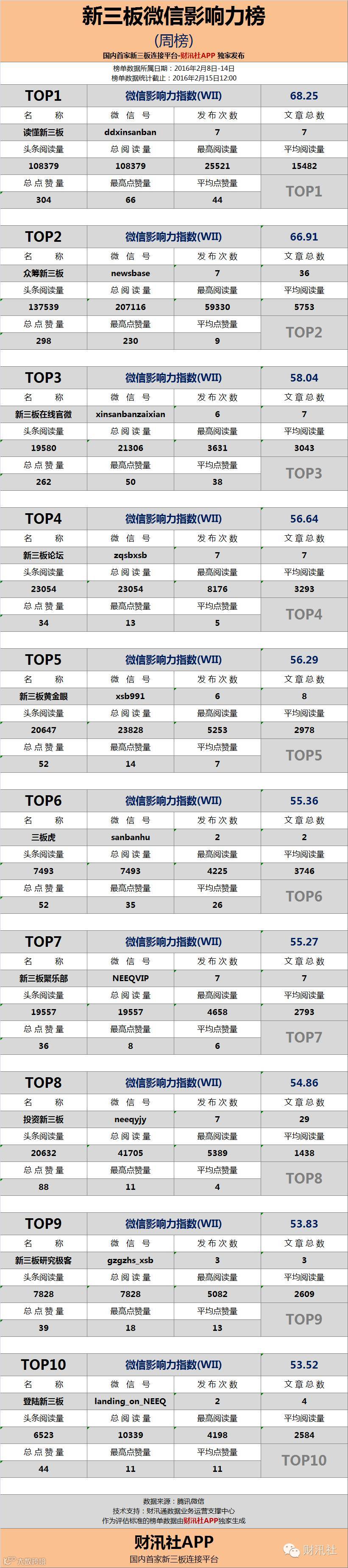 【新三板微信影响力榜】(周榜)|0208-0214 财汛社