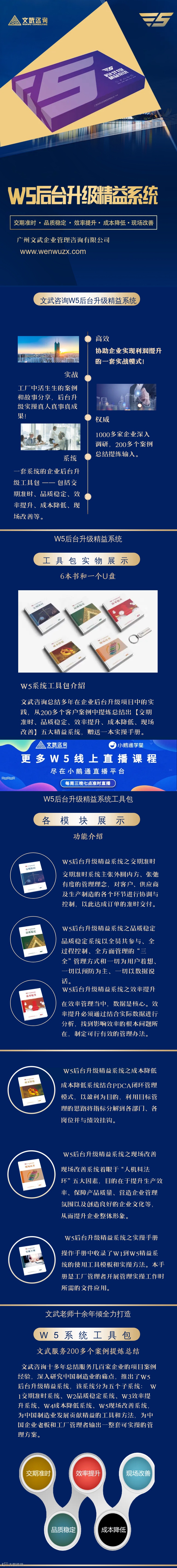 但是,管理这件事说着容易,干起来却发现总会有问题,因为企业的有效管理是要不断地将企业管理者的方案转换成落地的动作,但现实中的很多企业管理者有想法没有落地的动作,为了解决这个问题,广州文武咨询公司提取多年企业后台升级项目中的经验和成果,从300多家客户后台升级实践案例中提炼总结出来的五套系统形成落地动作工具包,分别是: