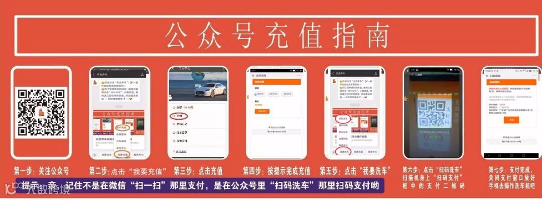 微信用户点击公众号页面下方的“我要洗车”→“扫码洗车”,然后通过公众号扫描设备上的支付码即可进行付费。