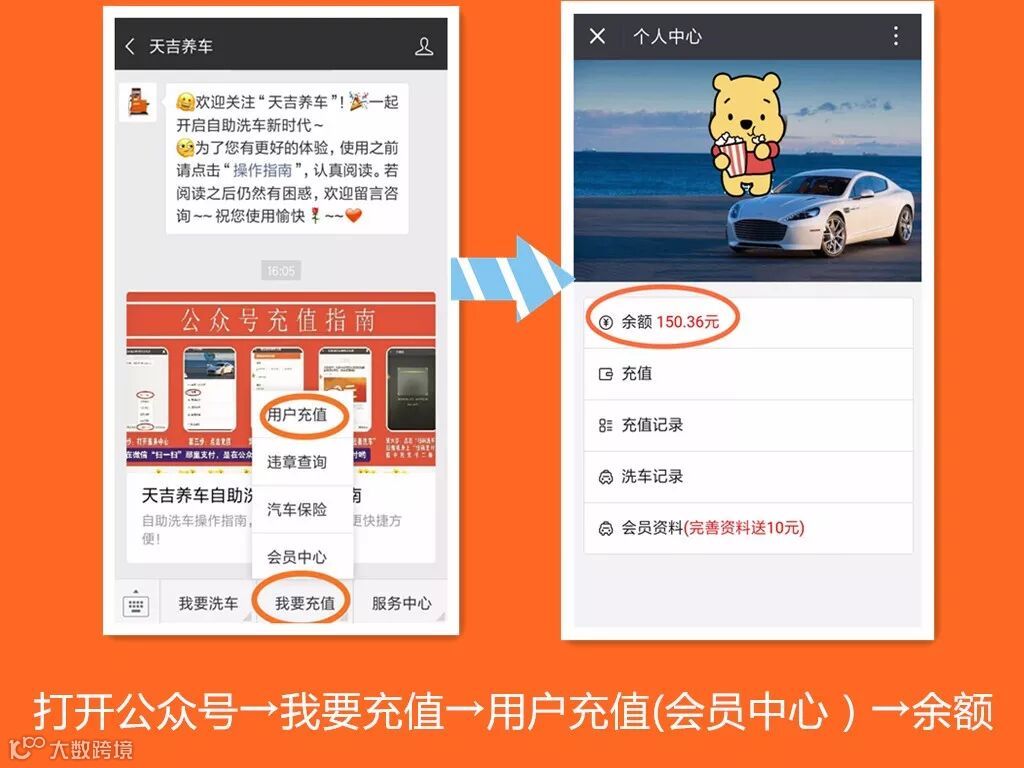 微信用户登录公众号,点击页面下方的“我要充值”→“用户充值”或“会员中心”,就可以进入个人中心之中进行充值、查询余额、充值记录、洗车记录、完善会员资料等。