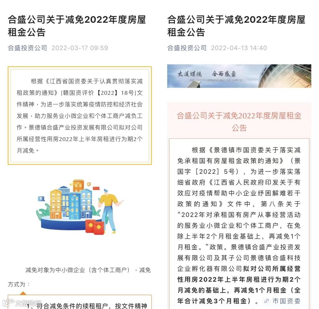 合盛公司根据《江西省国资委关于认真贯彻落实减租政策的通知》(赣国资评价〔2022〕18号)及《市国资委关于落实减免承租国有房屋租金政策的通知》(景国资字〔2022〕5号)的精神,扎实做好“六稳”、“六保”工作,让国家和省市租金减免政策实实在在地惠及企业,“用心”帮助企业纾困减负。