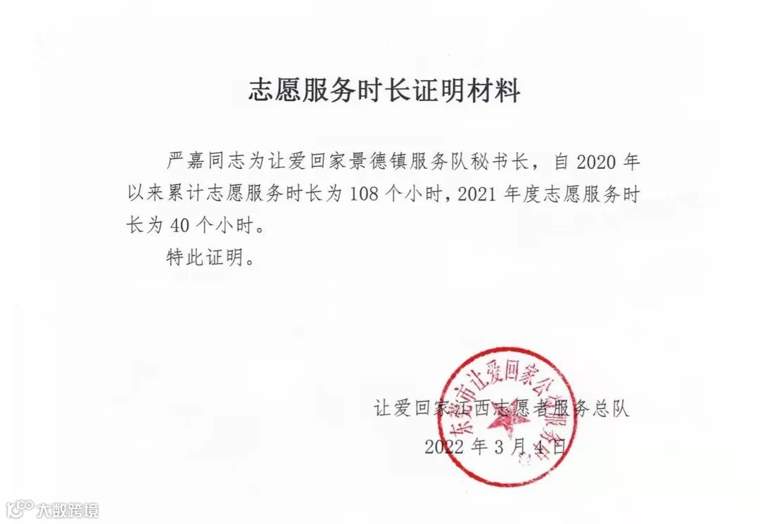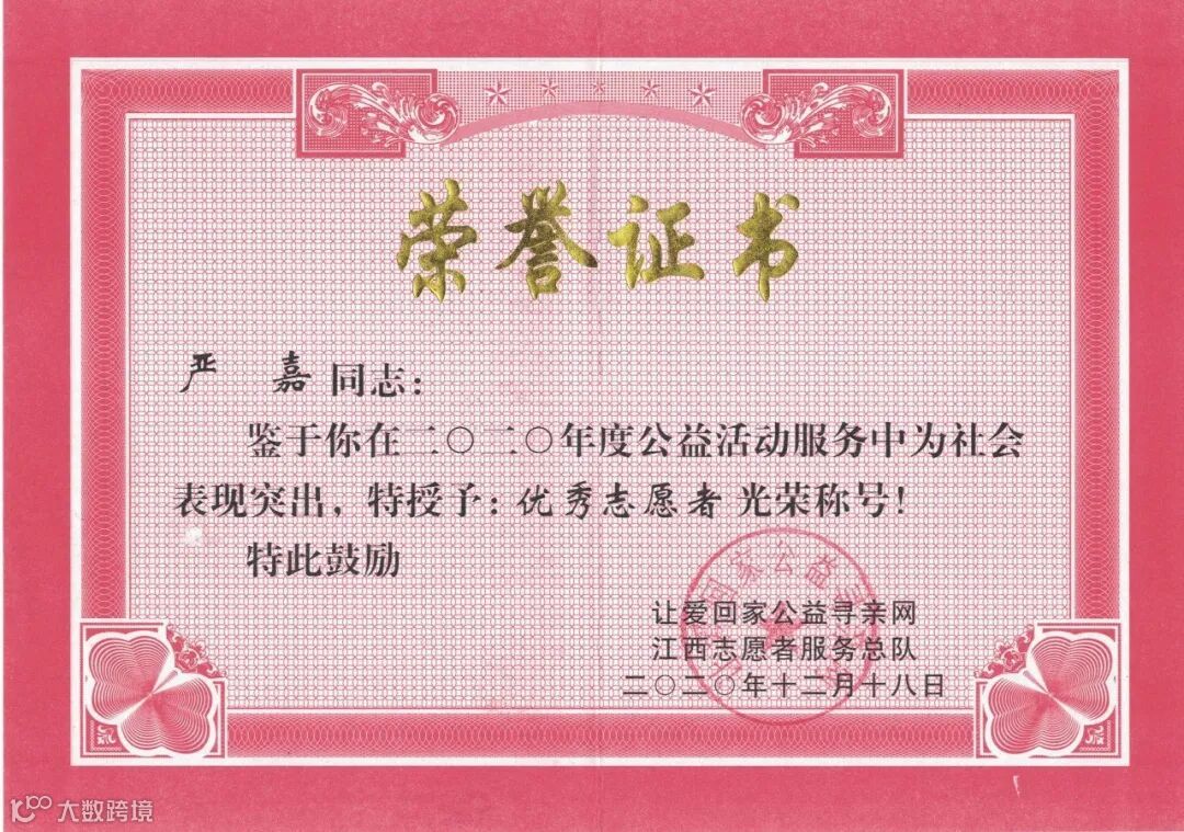 社会工作方面,严嘉也积极参加志愿者活动,以高度负责的态度和无私奉献的精神参与到每场志愿活动中去。近两年来,他累计志愿服务时长148个小时,并于2020年12月被让爱回家公益寻亲网江西志愿者服务总队评为2020年度优秀志愿者。