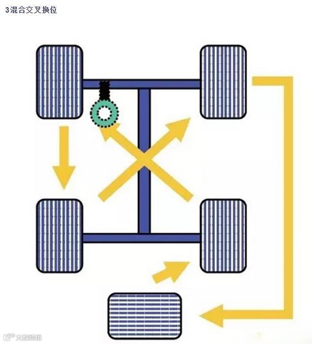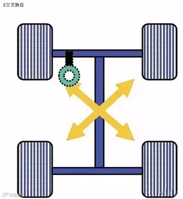 建议每5000~8000公里换位一次,通常的换位方法有3种(单导向花纹轮胎只适合前后平行换位):