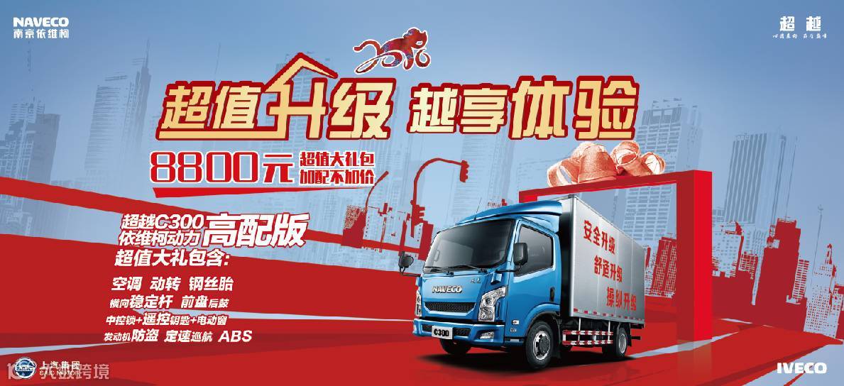 凡购买超越C300-33高配版依维柯动力产品,可尊享8800元超值配置大礼包;