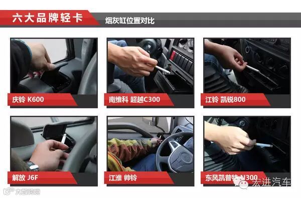卡车司机很多都有抽烟的习惯,因此烟灰缸设计的位置就显得比较重要了。六款轻卡中,庆铃、帅铃和J6F都把烟灰缸设计在门板上部靠前的位置,使用起来十分方便。