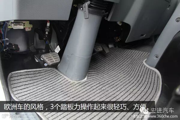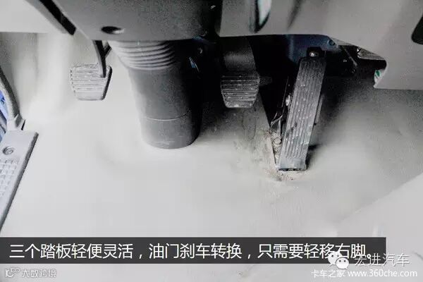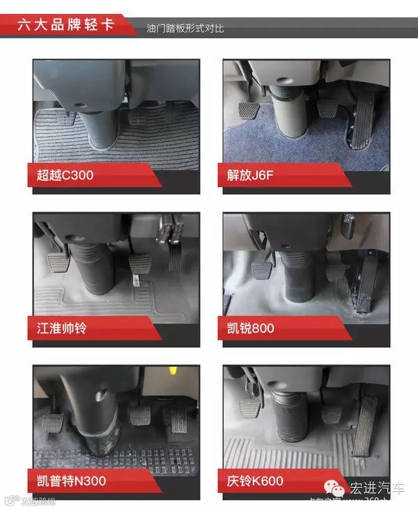 进入到驾驶室,我们发现这几款车的油门踏板各有千秋,上方左侧图的三款车采用悬挂式油门踏板,右侧三款车型则采用落地形式。总的来说,落地式的油门踏板会得到更多客户的青睐,至于优点这个就不多说了。