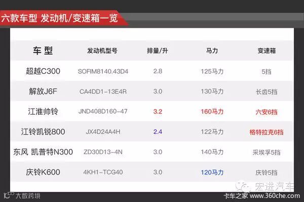 ● 动力篇:江淮帅铃马力最大,凯锐800排量最小