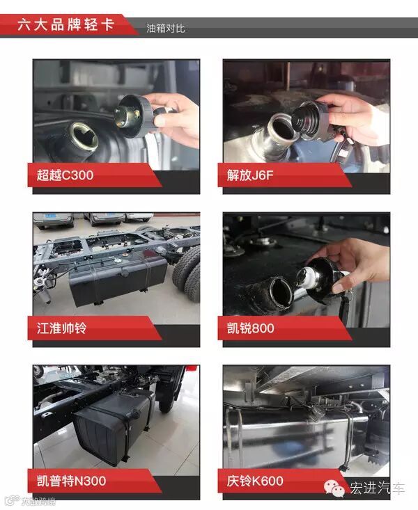 解放J6F和超越C300采用的是塑料油箱,其余四款车则用的是铁制油箱。而庆铃K600是唯一一款油箱不带防盗装置的。