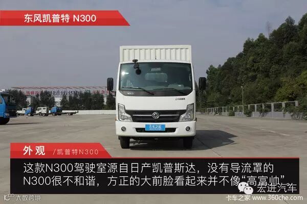 不知不觉,东风凯普特N系列上市已经好几年了,该款产品的驾驶室源自日产凯普斯达,一开始东风汽车就将这款N300定位于高端路线。一眼望去,没有装导流罩的N300在外观表现上可谓大打折扣,方方正正的大前脸看起来并不是那么的像有着“高富帅”之称的凯普斯达。搭载的ZD30发动机在动力方面表现不错,不过该车最大的缺点还是它的货厢,容积比较小。