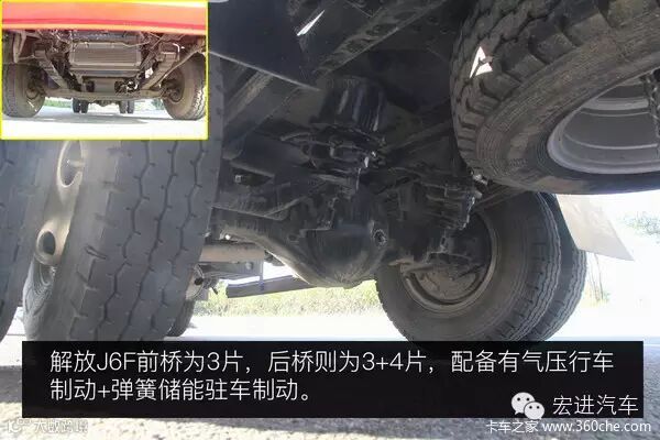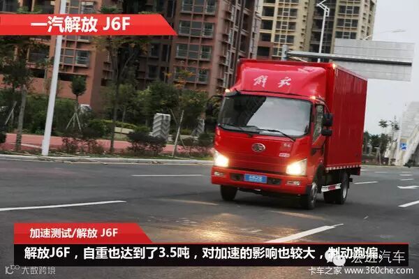 解放J6F搭载排量为3.0升的大柴道依茨4DD1发动机,最大功率130马力,最大扭矩320牛米。匹配5档手动变速箱。由于该车的自重达到了3.5吨,加速测试中受到明显影响,0-60加速时间为12.27秒,加速距离为127.48米,表现一般。由于该车采用的是气压制动,制动灵敏,但前轮制动比较粗暴,跑偏现象严重,制动性能感受不好。