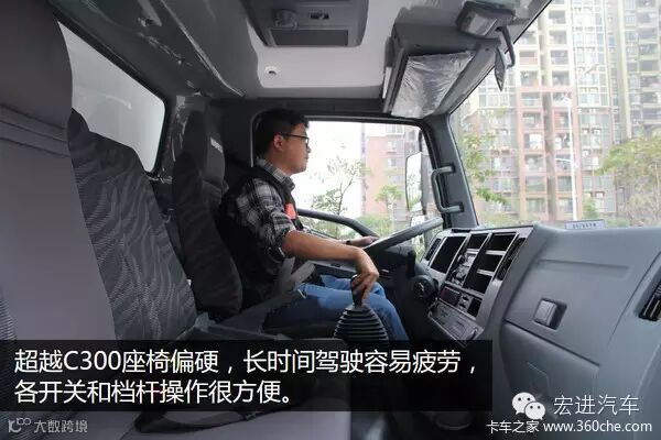 超越C300是窄体版驾驶室,座椅偏硬,长时间驾驶容易疲劳和产生不适,各开关及档杆操作轻巧顺手。仪表盘简洁直观,可读性很高,单色显示屏可切换多种数据显示。标配有冷暖空调,电动车窗,遗憾的是只有一键降,没有一键升的功能。驾驶室隔音做的也不错,总的来说,超越C300的整体舒适性不错。