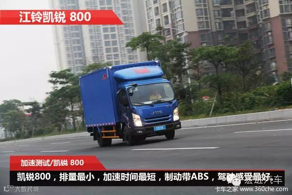 江铃凯锐800搭载排量为2.4升的JX4D24A4H发动机,最大功率122马力,最大扭矩320牛米,别看排量小,在动力数据上并不输给其它排量稍大的发动机。该车也是6款车中配装6档手动变速箱的车之一。在测试中,该车0-60公里加速时间为10.78秒,加速距离为108.96米。这款发动机的性能果然让人刮目相看,当然,配装6档变速箱也是一个方面。另外该车是6款车中唯一标配有ABS系统的,当车辆在紧急制动时表现非常平稳。