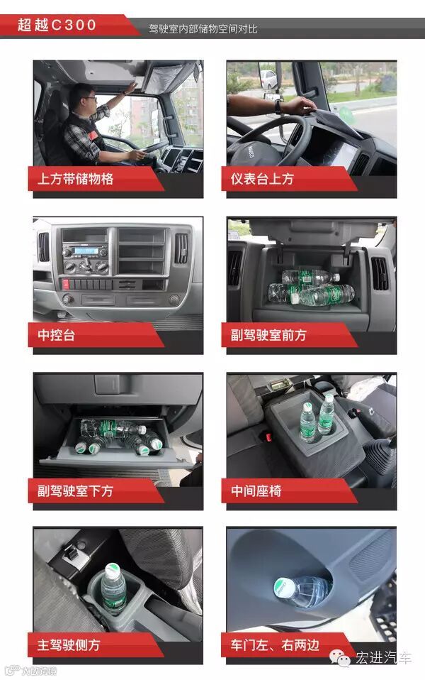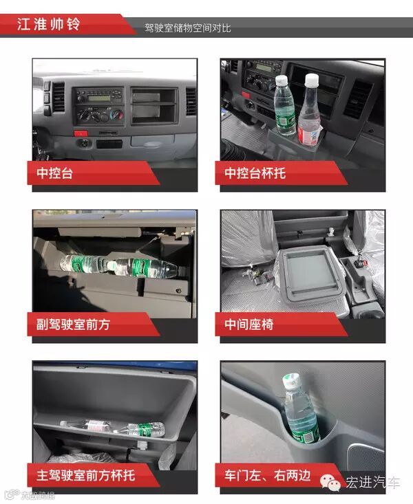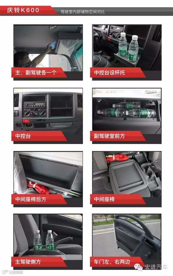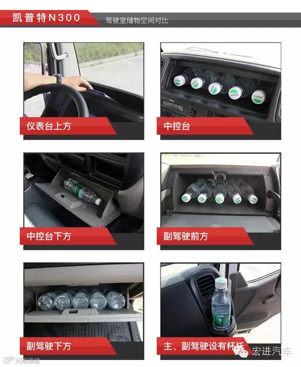 东风凯普特N300内部储物空间表现出色,差不多可以放下20瓶矿泉水了,是六款车中储物空间最丰富的;其次到超越C300;然而江铃凯锐800则表现一般,储物空间不如其它五款车。