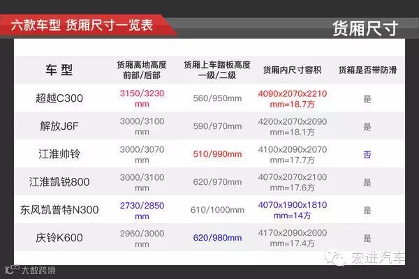 超越C300货厢无论在容积还是货厢离地高度表现最出色,其中货厢容积达到18.7方;东风凯普特是六款车之中容积最小的,只有14方,表现是一般般。