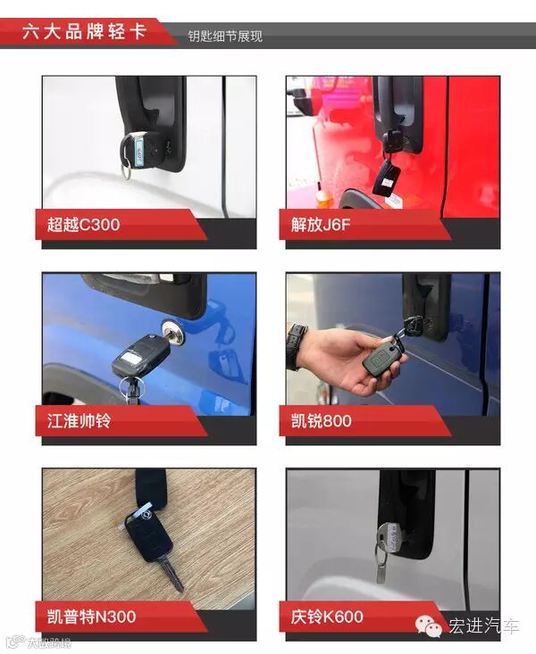 图中上方四款车型都装配了遥控钥匙,超越C300与钥匙集成一块,而凯普特N300则只是装饰;庆铃K600相对来说比较简单,只是配了一把普通的钥匙。