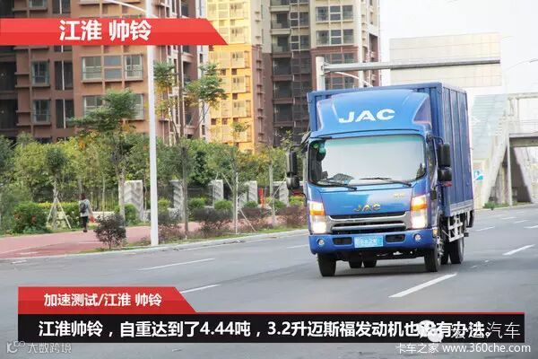 江淮帅铃搭载排量为3.2升迈斯福JND408D发动机,最大功率160马力,最大扭矩450牛米,是6款车中排量及功率扭矩最大的。由于该车是从用户手中租赁过来的,自重达到了4.44吨,对加速测试有很大的影响。在实际测试中,该车0-60公里加速时间为12.92秒,加速距离为131.35米。帅铃也采用气压制动,但前轮标配的是盘式制动器,对制动的平稳性有一定提高,在紧急制动过程中,跑偏甩尾现象不是那么严重。