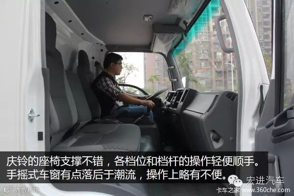 庆铃K600是在原600P的基础上改进的宽体驾驶室,驾乘相对更舒适一些。座椅支撑不错,操作档杆及一些按钮的比较顺手。车窗还是沿用手摇式,这个不太方便。仪表盘简洁,观察方便,没有一点多余的东西,标配冷暖空调,收音机带有USB接口,可以自己下载歌曲到U盘播放。驾驶室隔音挺好,当然这也和庆铃发动机噪音本身较小有关,总体来说,整体舒适性还行。