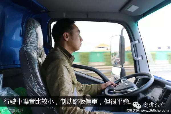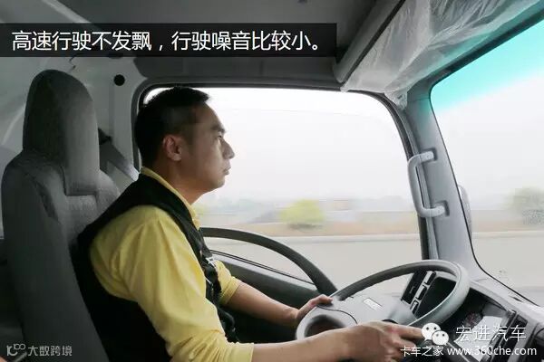 解放J6F在噪音和震动控制上,是这几款车中最大的。在80公里巡航的时候,两人交谈需要把声音放大一些。由于该车采用的是气压制动,制动力没有任何问题,但是前轮制动工作较为粗暴,在轻点制动的时候会发生跑偏现象。液压助力的转向,操作轻便灵敏,档位也比较清晰,操作上还是比较便利的,驾驶感受比较一般。