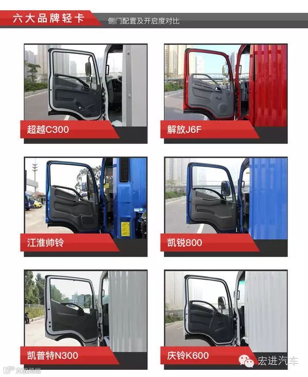 说到方便性部分,超越C300、江淮帅铃和凯锐800表现不错,也比较厚道,均配备了电动车窗;庆铃K600、凯普特N300和解放J6F则采用了传统的手摇车窗。其中六款车中只有凯普特N300的车门开启度在80度左右,其余五款车能够达到90度。