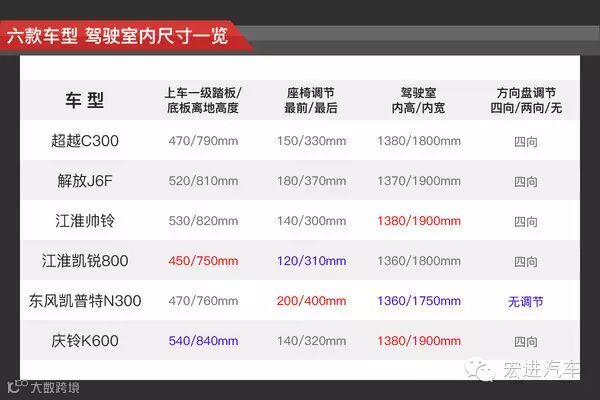 这6款车的内饰就跟外观一样,想要分个高低也不容易。首先小编对比了这六款车,个人感觉超越和帅铃内饰做工细致,有点接近于轿车风格;K600相对经典、还是带有传统保守的味道,不过也可以说是简洁实用;其余两款车都有简化,但不如超越和帅铃具有科技感。