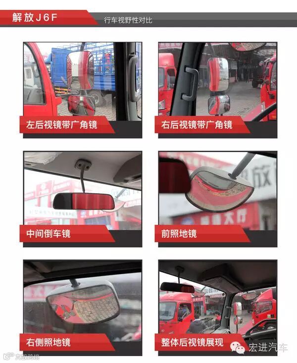 视野性好不好是关乎到行车安全的,后视镜可谓起到很大的作用。在这一轮环节中,帅铃、庆铃K600及解放J6F的镜面可以说非常到位,几乎每个角度都装有一块后视镜;其余三款车则缺少了其中一点,不如它们三款车完美。