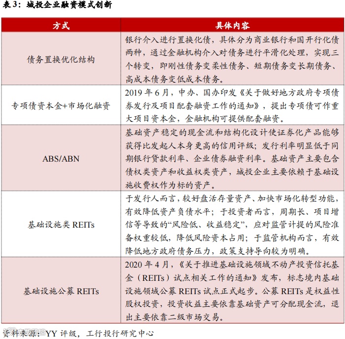 回顾国内城投企业的转型案例,一方面,城投平台通过股权改革(包括资产重组、划转/划入、引入战投等形式)和多元化投资的方式进行业务层面的转型探索;另一方面,城投企业拓宽原有融资渠道,创新融资模式成为化解债务的重要抓手。