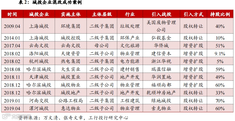 但值得关注的是,城投企业因盈利能力弱、债务规模大、非市场化制度、资产定价困难、员工构成复杂等因素而导致混改难度较大。即便是在政府推动力度大、混改进展较快的天津,城投成功混改的案例也仅1家。2018年12月,天津城投置地混改落地,华润置地增资79.34亿元,获得天津城投置地49%股权,天津城市基础设施建设持股51%。